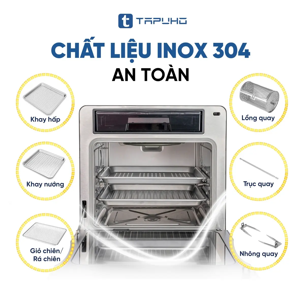Nồi chiên hơi nước Tapuho sở hữu công nghệ hấp siêu nhiệt Steam Pro giúp thực phẩm chín nhanh, đều và giữ được độ mềm mọng, tươi ngon. Bên cạnh đó, công nghệ chiên không dầu Rapid Air giúp bạn chế biến các món chiên giòn rụm, giảm đến 96% lượng chất béo có trong thực phẩm, đảm bảo sức khỏe cho cả gia đình.